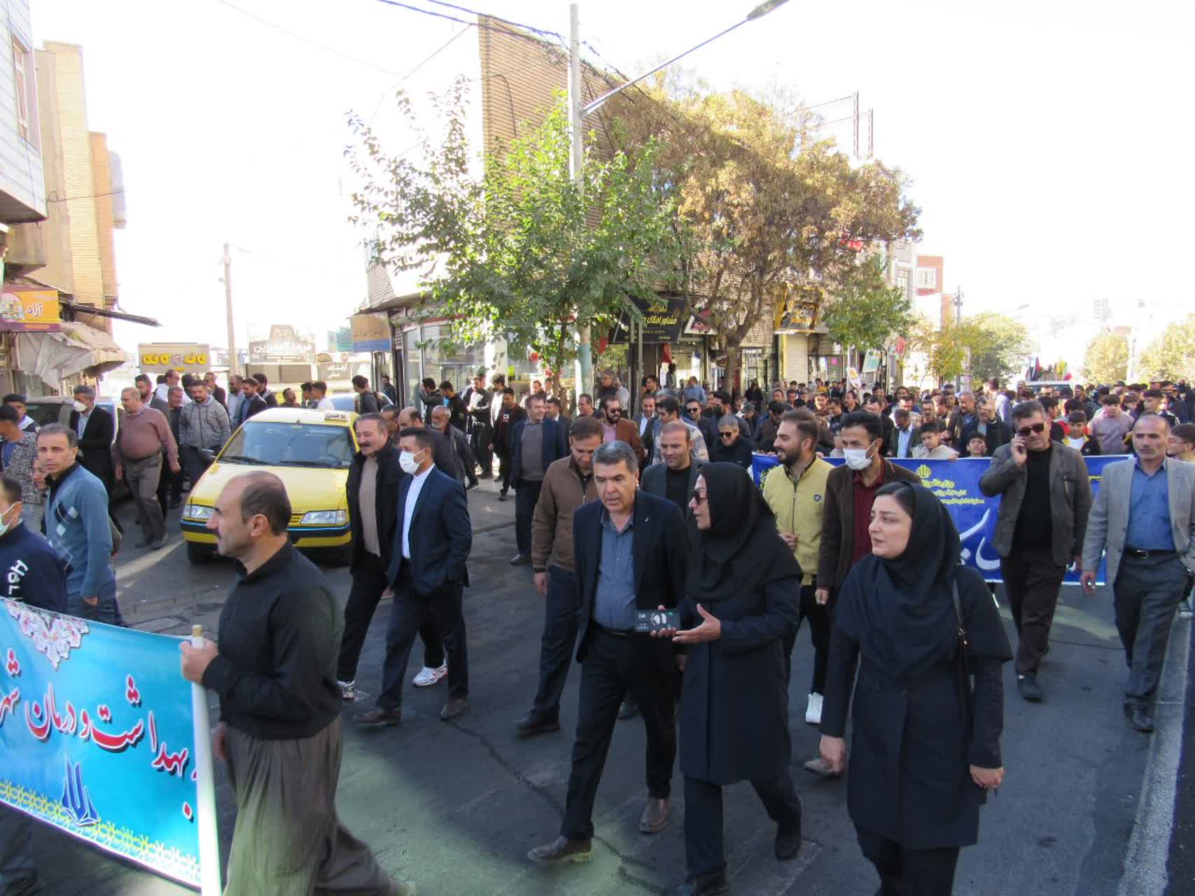 مدیر،مسئولین وکارکنان شبکه بهداشت ودرمان شهرستان سقز همزمان باسراسر ایران اسلامی درراهپیمایی یوم ا.. 13 آبان شرکت نمودند.
