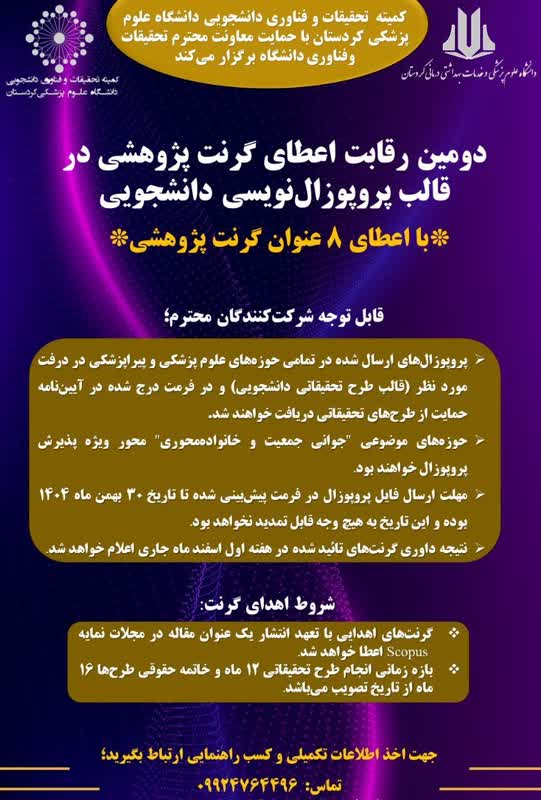 کمیته تحقیقات و فناوری دانشجویی دانشگاه علومپزشکی کردستان با حمایت معاونت تحقیقات و فناوری دانشگاه، دومین رقابت اعطای گرنت پژوهشی دانشجویی را با هدف حمایت از طرحهای تحقیقاتی در قالب پروپوزالنویسی برگزار میکند.